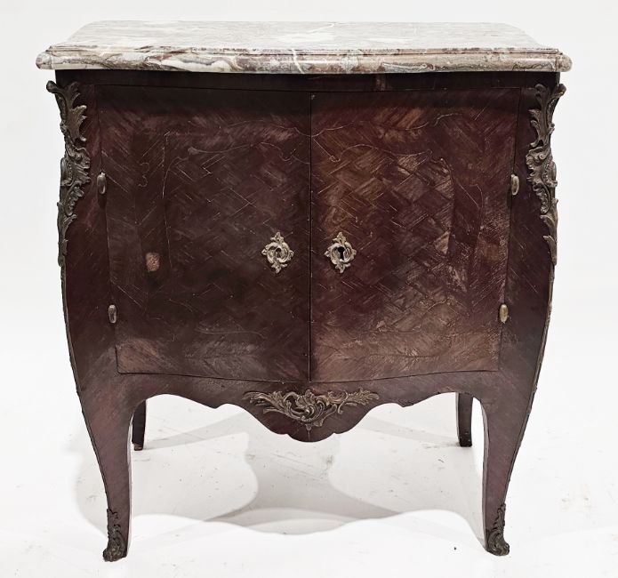 19th century French commode of bombe form, the shaped marble top over a kingwood veneered base with diamond marquetry decoration, having two panel cupboard doors and ormolu foliate scroll mounts, 98cm high x 79cm wide x 48cm deep