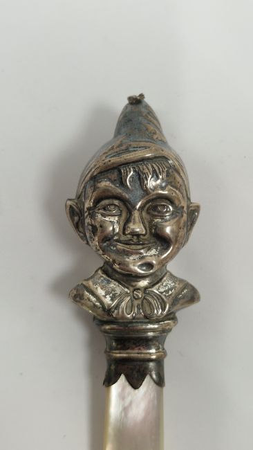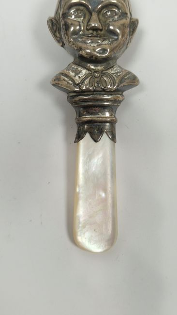Silver and mother-of-pearl child's rattle by W H Collins & Co, Birmingham 1934, modelled as an elf's head with mother-of-pearl handle (missing bell), 10cm long