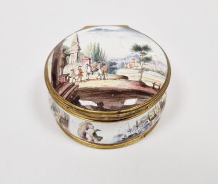 German enamel and gilt-metal mounted circular snuff box, circa 1760, painted in the Meissen style with figures before buildings in landscapes alternating with putti and trophies (cracked) 6 cm diam.  Provenance:  Hicks Beach Estate.  The majority of pieces in this collection originate from Williamstrip, Coln St Aldwyn, family seat from 1788 to 2008 and thereafter Mill House, Coln St Aldwyn.  Sir Michael Hicks Beach, Bt, succeeded his father as 9th Baronet of Beverston in 1854.  He became a Conservative Member of Parliament in 1864 and served twice as Chancellor of the Exchequer, from 1885 to 1886 and again from 1895 to 1902.  In 1906 he was raised to the peerage as Viscount St Aldwyn and in 1915 became the first Earl St Aldwyn.