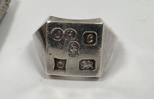 Silver compact, Birmingham 1947, William Suckling Ltd, of square form with Art Deco and engine turned decoration, 7.2cm wide together with silver ring, Birmingham 1977, the head stamped with hallmarks, size T 1/2, approximate total weight 4.03ozt (2)