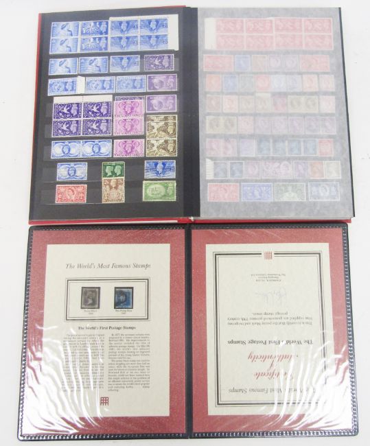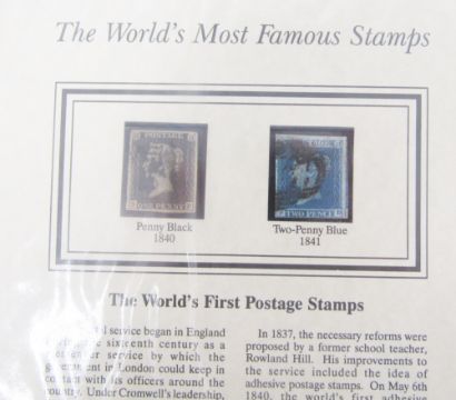 Westminster Collections Ltd ' The World's most famous stamps ' folder including 1840 Penny Black and 1841 Penny Blue and an album of British stamps including a collection of Penny Reds, Victoria Jubilee issues, Edward VII, George V and George VI stamps together with collection of stamps and first day covers including three stamp albums with world stamps, quantity of stamped envelopes and stamps on paper plus three empty stamp albums