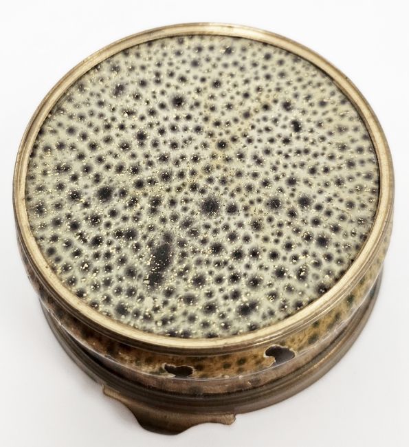 Staffordshire enamel and gilt-metal mounted snuff-box, 18th century, the cover decorated in the German style with a traveller before buildings in river landscape, the box in simulated shagreen, 6 cm diam.  Provenance:  Hicks Beach Estate.  The majority of pieces in this collection originate from Williamstrip, Coln St Aldwyn, family seat from 1788 to 2008 and thereafter Mill House, Coln St Aldwyn.  Sir Michael Hicks Beach, Bt, succeeded his father as 9th Baronet of Beverston in 1854.  He became a Conservative Member of Parliament in 1864 and served twice as Chancellor of the Exchequer, from 1885 to 1886 and again from 1895 to 1902.  In 1906 he was raised to the peerage as Viscount St Aldwyn and in 1915 became the first Earl St Aldwyn.
