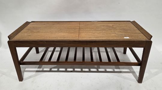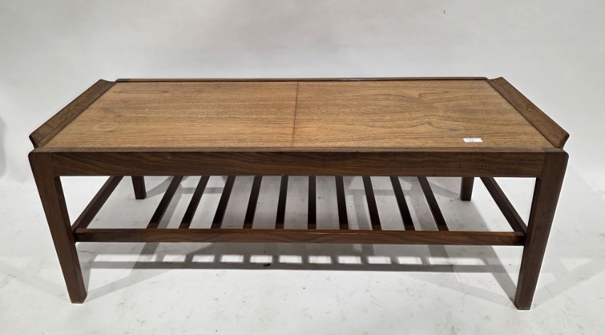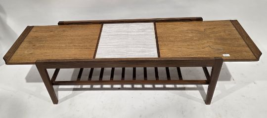 Mid-century Remploy teak extending coffee table, the top with two leaves drawing back to a formica top section, on square legs united by a slatted under-shelf, 42cm high x 112cm long x 44.5cm deep (please note VAT will be payable on the hammer)