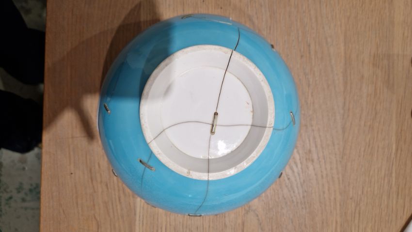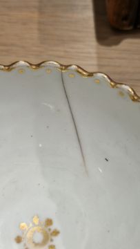 English porcelain turquoise ground composite part tea and dessert service in the Minton style, impressed black registration lozenges, impressed T.F factory marks, probably for Thomas Ford, circa 1870-80, basket-moulded with gilt rims, comprising two large figural comports with putti supports, four medium sized comports, four low footed comports, eighteen plates; together with an English porcelain turquoise ground part tea-service with shaped gilt C-scroll rims, comprising: three plates, ten teacups, four coffee cups and 33 saucers and a bowl (damages and repairs)  Provenance:  Hicks Beach Estate.  The majority of pieces in this collection originate from Williamstrip, Coln St Aldwyn, family seat from 1788 to 2008 and thereafter Mill House, Coln St Aldwyn.  Sir Michael Hicks Beach, Bt, succeeded his father as 9th Baronet of Beverston in 1854.  He became a Conservative Member of Parliament in 1864 and served twice as Chancellor of the Exchequer, from 1885 to 1886 and again from 1895 to 1902.  In 1906 he was raised to the peerage as Viscount St Aldwyn and in 1915 became the first Earl St Aldwyn. Condition Report Two large comports - 24.5 cm diam. x 20 cm high: in good order. Four medium sized comports - 24.5 cm diam. x 14 cm high: one with chipping to putti's feet, another with one putto's head restuck and further light chipping to toes. Four low footed comports: one extensively cracked and riveted, another cracked and riveted and the third & fourth with patches of staining. Eighteen basket-moulded plates, 23.5 cm diam.: Three plates with C-scroll borders, one with section of rim cracked out but present, all extensively cracked and damaged. Slop bowl is extensively cracked and with riveted repairs. Seven teacups are cracked and riveted and the remainder are also cracked. All four coffee cups are cracked. Six saucers are cracked. Some rubbing, glaze crazing and wear to gilding and slight flaking to turquoise ground.