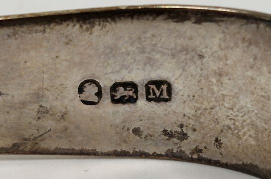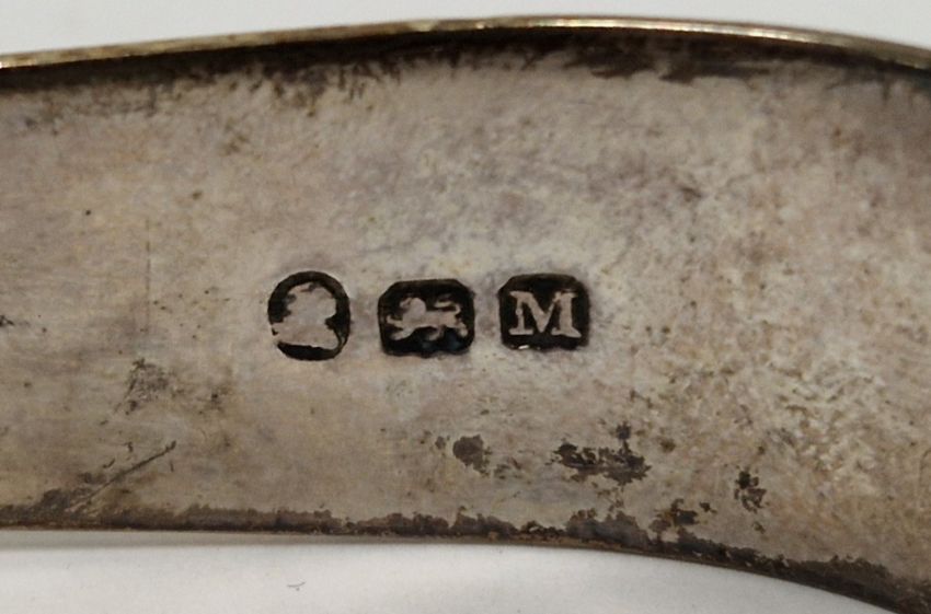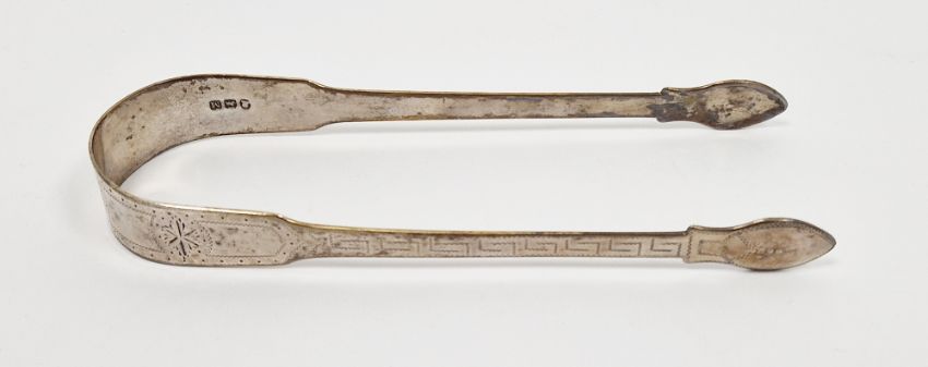 Pair of George III silver sugar tongs by Peter & William Bateman, London 1807, with bright cut decoration, monogrammed, 1ozt approx