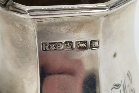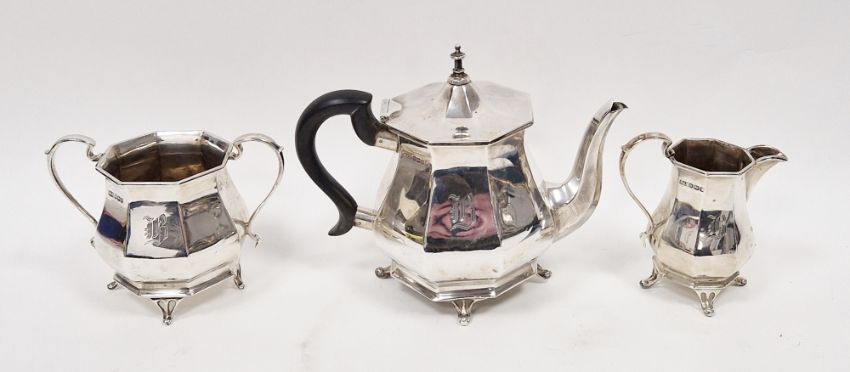 Edwardian silver bachelor's teaset by Roberts & Belk, Sheffield 1906/1907, comprising teapot, two-handled sugar bowl and milk jug, each of octagonal panelled form raised on four pierced bracket feet, engraved monogram B, teapot 15cm high, total weight 18ozt approx (please note VAT will be payable on the hammer)