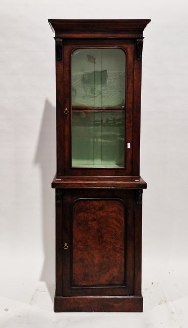 Victorian burr walnut narrow library bookcase, the upper section with single glazed door opening to a green painted interior with two adjustable shelves, the lower section with panelled door opening to two shelves, on plinth base, 98cm high x 63cm wide x 41cm deep