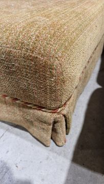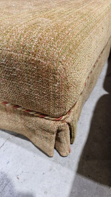Large country house ottoman of rectangular form, upholstered in a green fabric with flecks of brown and cream, on wooden turned tapering legs with castors, 38cm high x 156cm wide x 105cm deep  Provenance:  Hicks Beach Estate.  The majority of pieces in this collection originate from Williamstrip, Coln St Aldwyn, family seat from 1788 to 2008 and thereafter Mill House, Coln St Aldwyn.  Sir Michael Hicks Beach, Bt, succeeded his father as 9th Baronet of Beverston in 1854.  He became a Conservative Member of Parliament in 1864 and served twice as Chancellor of the Exchequer, from 1885 to 1886 and again from 1895 to 1902.  In 1906 he was raised to the peerage as Viscount St Aldwyn and in 1915 became the first Earl St Aldwyn. Condition Report Some maks, fading and loose threads on upholstery. General wear and tear.