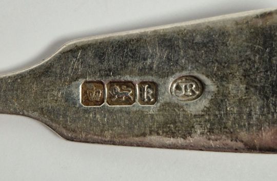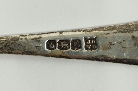 Set of ten silver fiddle pattern teaspoons, monogrammed, Sheffield 1902, 6ozt approx and a silver mustard spoon