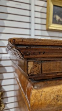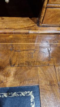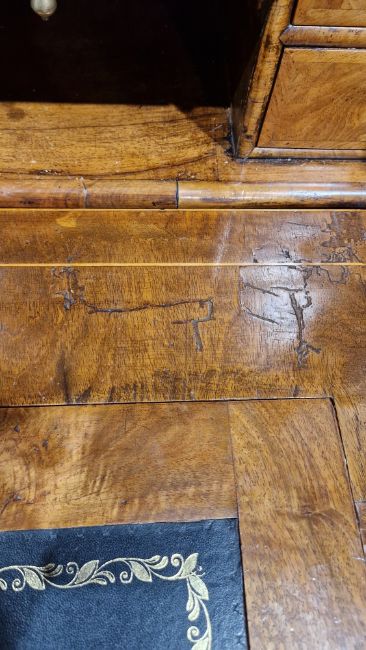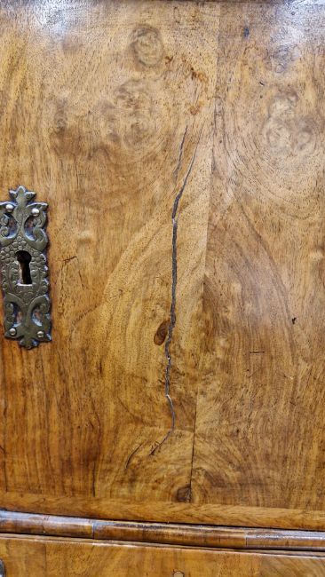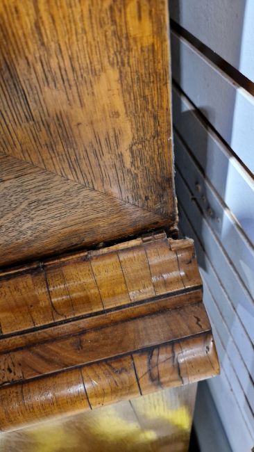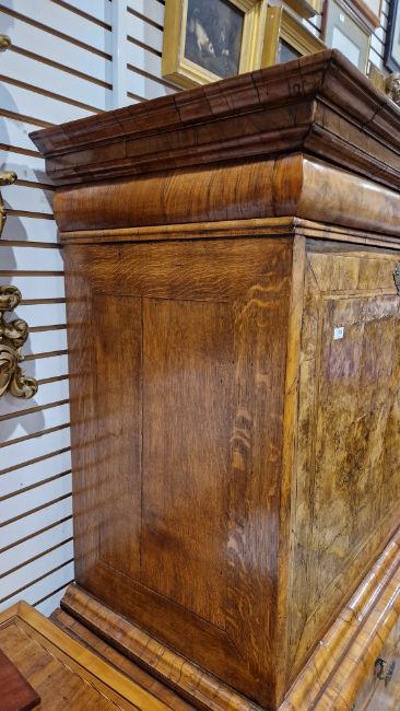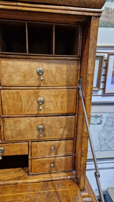 Early 18th century burr walnut and feather banded secretaire chest, the moulded cornice over a cushion drawer, the fall front with leather inset writing surface and fitted interior with an arrangement of drawers and pigeonholes, having brass drop and knob handles, over two short and two long graduated drawers with brass drop handles and shaped escutcheons, on ogee bracket feet, 167.5cm high x 118cm wide x 54cm deep  Provenance:  Hicks Beach Estate.  The majority of pieces in this collection originate from Williamstrip, Coln St Aldwyn, family seat from 1788 to 2008 and thereafter Mill House, Coln St Aldwyn.  Sir Michael Hicks Beach, Bt, succeeded his father as 9th Baronet of Beverston in 1854.  He became a Conservative Member of Parliament in 1864 and served twice as Chancellor of the Exchequer, from 1885 to 1886 and again from 1895 to 1902.  In 1906 he was raised to the peerage as Viscount St Aldwyn and in 1915 became the first Earl St Aldwyn. Condition Report Surface scratches, scuffs and knocks. Fading/discolouration. Areas of loss and some repairs to veneer, some raised sections of veneer.  Old woodworm around top and feet resulting in some small losses to wood, mainly to top, cornice and lower part of top section. Old worm on sections of veneer. Handles look original but could have replaced. Split to top of interior writing slope. General wear and tear