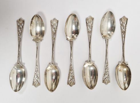 Set of seven silver teaspoons by Josiah Williams & Co, London 1926, the stems modelled as golf clubs, with pierced scrolling decoration and shell terminal, engraved with acronym to reverse of bowl, 2.5ozt approx