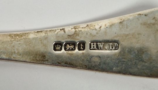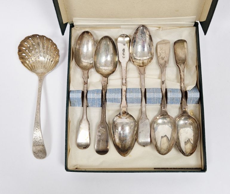 Matched set of George III and later silver fiddle pattern teaspoons, various dates and makers and a silver sifting spoon, Sheffield 1911 with engraved floral decoration, total weight 6ozt approx