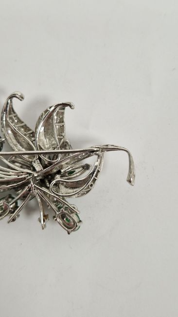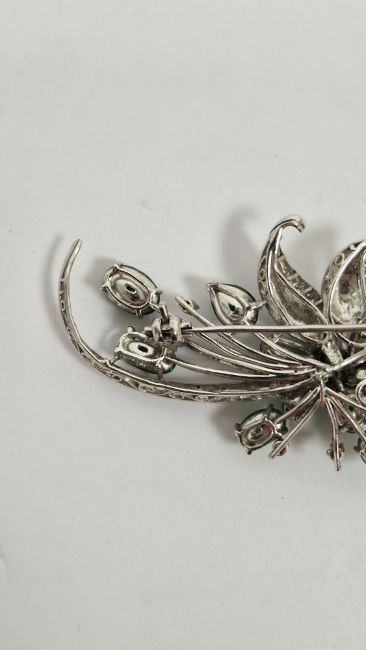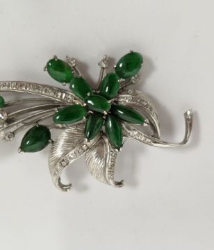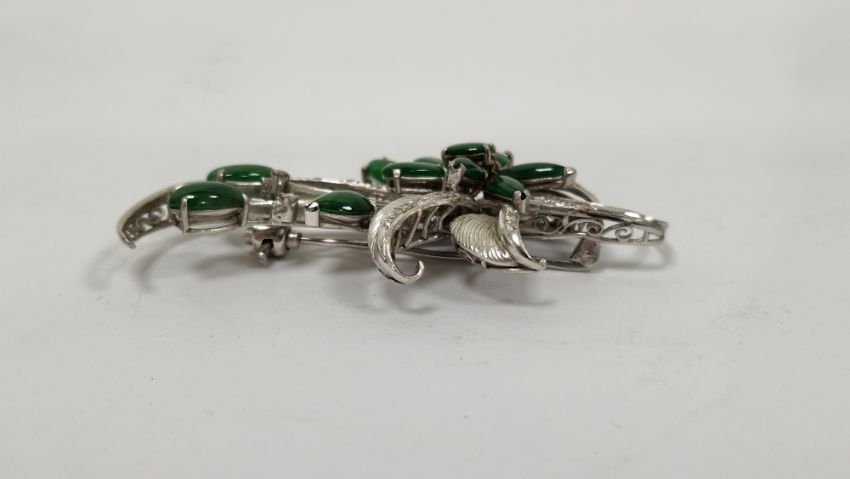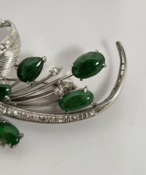 set with polished oval jade cabochons and eight cut diamonds, marked 14K, 6cm long, 12.8g approx