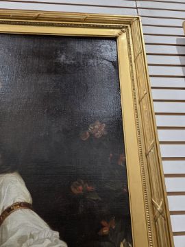 English school in the manner of Sir Peter Lely (1618-1680) Oil on canvas  Three-quarter length portrait of a lady, seated and holding a floral spray, inscribed 'C Wither of Hall Place', 117cm x 93cm and the reed and ribband giltwood frame  In 1682 Charles Wither (1663-1697) married Dorothy Smith (daughter of Sir William Smith, 1st Baronet of Redcliff) and the couple had two sons and two daughters.  His eldest son's younger daughter, Anne, married William Beach (1718-1788), a direct ancestor of the Hicks Beach family, and her elder sister, Henrietta Maria (1714-1790) married Thynne Worsley (d. 1741) in 1726.  Lot 339 in this auction is the salver with their armorial.  This portrait appears to represent one of these two women. Provenance:  Hicks Beach Estate.  The majority of pieces in this collection originate from Williamstrip, Coln St Aldwyn, family seat from 1788 to 2008 and thereafter Mill House, Coln St Aldwyn.  Sir Michael Hicks Beach, Bt, succeeded his father as 9th Baronet of Beverston in 1854.  He became a Conservative Member of Parliament in 1864 and served twice as Chancellor of the Exchequer, from 1885 to 1886 and again from 1895 to 1902.  In 1906 he was raised to the peerage as Viscount St Aldwyn and in 1915 became the first Earl St Aldwyn. Condition Report