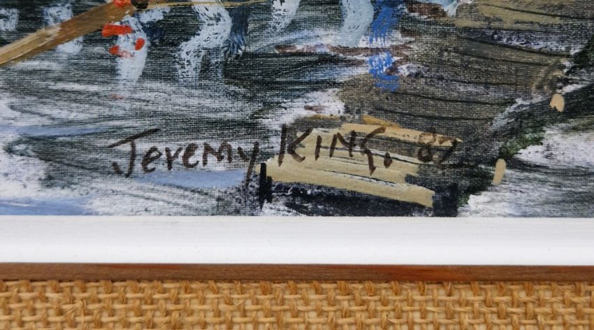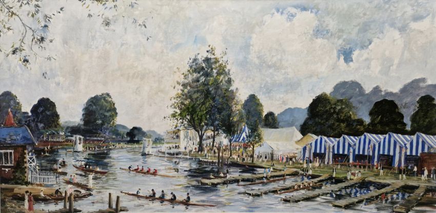 Jeremy King (20th century)  Oil on board Henley Regatta with numerous figures, tents and boats, signed lower right and dated '82, 60cm x 120cm  Provenance:  Hicks Beach Estate.  The majority of pieces in this collection originate from Williamstrip, Coln St Aldwyn, family seat from 1788 to 2008 and thereafter Mill House, Coln St Aldwyn.  Sir Michael Hicks Beach, Bt, succeeded his father as 9th Baronet of Beverston in 1854.  He became a Conservative Member of Parliament in 1864 and served twice as Chancellor of the Exchequer, from 1885 to 1886 and again from 1895 to 1902.  In 1906 he was raised to the peerage as Viscount St Aldwyn and in 1915 became the first Earl St Aldwyn.
