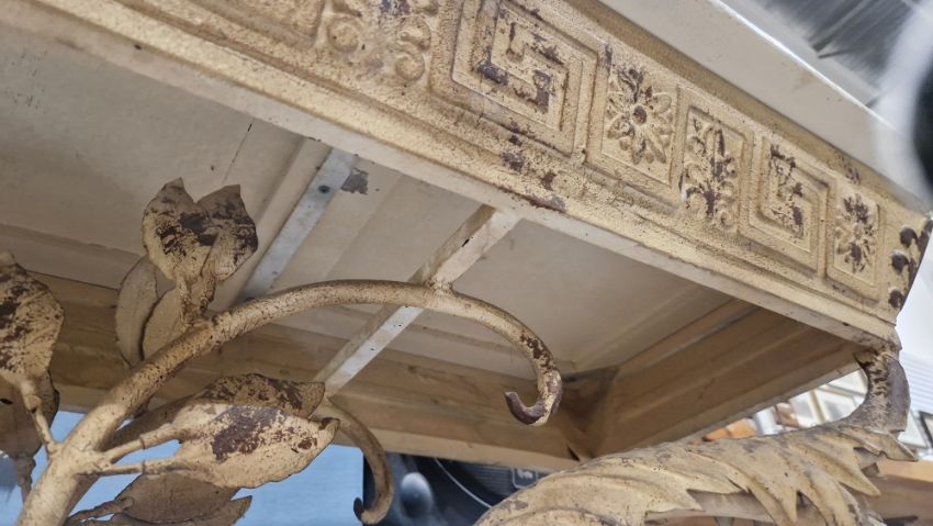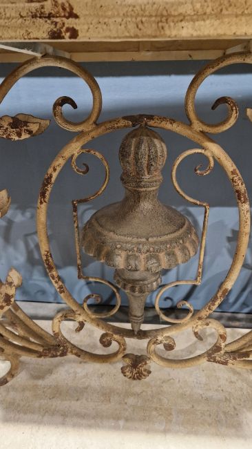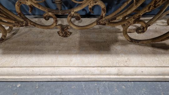 Shell stone brushed limestone topped gilt metal console table with ornate scroll supports, 84cm high x 174cm wide x 46cm deep  Condition Report Please see amended description. Not marble.Surface scratches and scuffs, scroll supports with losses to gilding and numerous areas of rust. Tiny chips to corners of top and base. General wear and tear.