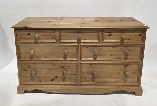 Modern pine chest having an arrangement of seven drawers with turned wooden handles, on bracket feet, 77cm high x 131cm wide x 43cm deep
