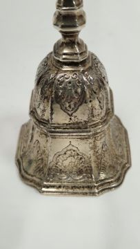 Edwardian silver handbell by Harry Brasted, London 1908, of shaped square form engraved with shell motifs, moulded borders and knopped handle, 11cm high, 5ozt approx  Provenance:  Hicks Beach Estate.  The majority of pieces in this collection originate from Williamstrip, Coln St Aldwyn, family seat from 1788 to 2008 and thereafter Mill House, Coln St Aldwyn.  Sir Michael Hicks Beach, Bt, succeeded his father as 9th Baronet of Beverston in 1854.  He became a Conservative Member of Parliament in 1864 and served twice as Chancellor of the Exchequer, from 1885 to 1886 and again from 1895 to 1902.  In 1906 he was raised to the peerage as Viscount St Aldwyn and in 1915 became the first Earl St Aldwyn. Condition Report Good overall condition with light surface scratches, accretions and tarnishing. General wear and tear.