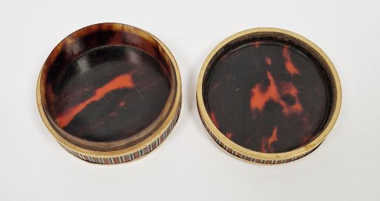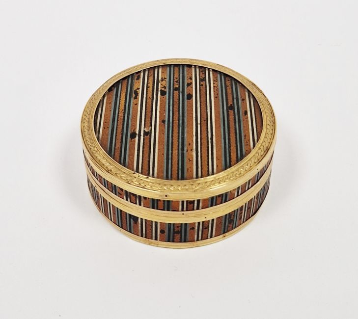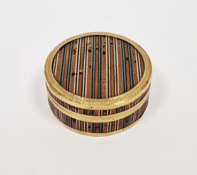 French tortoiseshell, yellow-metal and vernis martin circular snuff-box, late 18th century, decorated with striped gold, grey and cream vernis martin, 6.2cm diameter  Provenance:  Hicks Beach Estate.  The majority of pieces in this collection originate from Williamstrip, Coln St Aldwyn, family seat from 1788 to 2008 and thereafter Mill House, Coln St Aldwyn.  Sir Michael Hicks Beach, Bt, succeeded his father as 9th Baronet of Beverston in 1854.  He became a Conservative Member of Parliament in 1864 and served twice as Chancellor of the Exchequer, from 1885 to 1886 and again from 1895 to 1902.  In 1906 he was raised to the peerage as Viscount St Aldwyn and in 1915 became the first Earl St Aldwyn.