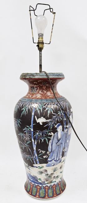 Large Japanese late Meiji period (1868-1912) inverted baluster vase, iron red character marks to base, painted in underglaze blue with figures amongst bamboo, reserved with cranes in flight and flowering prunus, in overglaze enamels above a landscape panel and lappet pattern foot rim (adapted as a lamp) (losses, damage and restoration to rim), 65.5cm high