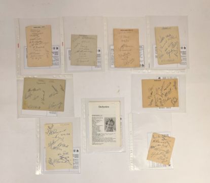 Derbyshire C.C.C. autographs -  1928 , 12 players to include G.R. Jackson, Hill-Wood, Ford ( 31 matches 1926-34) Richardson, Slater etc. , c.1928-29 11 pencil signatures eg Jackson, Bowden, Elliott, Hutchinson etc. , 1931 , 8 signatures eg Arthur Richardson ( Captain) Harry Storer, Garnet lee, Denis Smith etc., c 1947-48 10 signatures eg George Pope, Denis Smith etc. c. 1948 signed 11 players, 1949 signed  by 11 players , and another and 1985 ( 9 slips on 1 folder) (please note VAT will be payable on the hammer)
