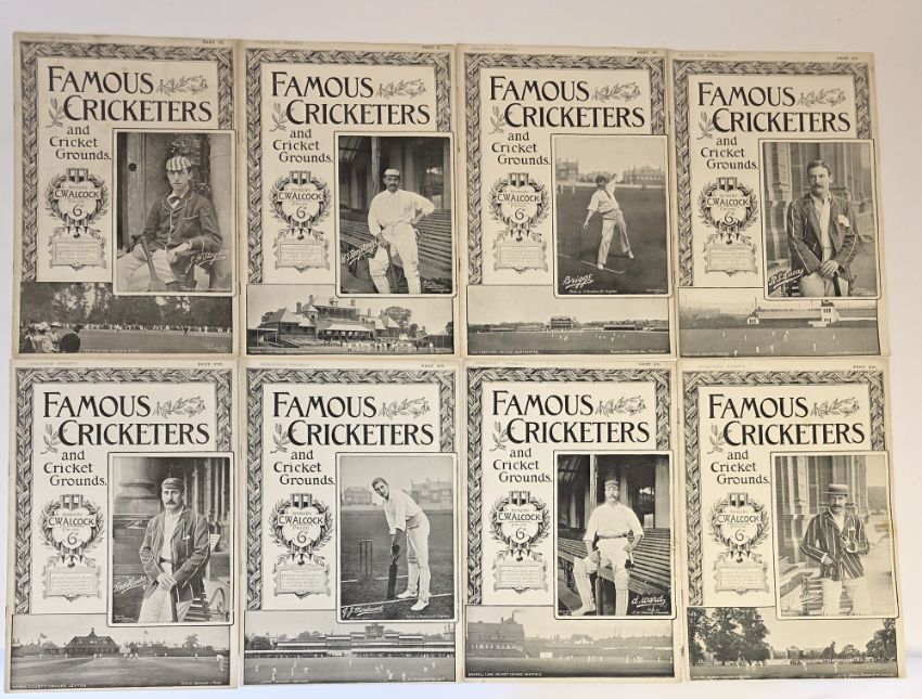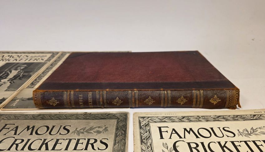 Alcock, Charles William ( ed) " Famous Cricketers and Cricket Grounds" complete set, 18 weekly parts, each of 16 pages, three loose volumes parts X, VI and another , and bound volumes of " Famous Cricketers amd Cricket Grounds", half red leather over red boards, boards and corners rubbed