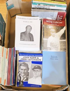 Large quantity of books relating to different clubs, some ACS Publications, Transvaal Cricketers 1889-1990 through to 1993 and 1994 and other  cricketers 1997-98, The Famous Cricketer Series, Cricket Grounds of Leicestershire, Oxford Cricket Board, The John Player Cricket Year Book, World of Cricket, Cheshire County Cricket Handbook,  Devizes Cricket Club 1850-1950 etc. (2 boxes)