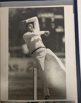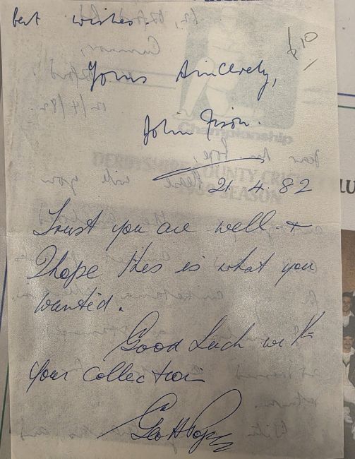 Derbyshire County Cricket Club, press photographs to include Peter Bowler, Mike Hendrick, Phillip Defreitas, Dominic Court, a handwritten letter to Geoff Pope from a John Fison (?) to which Geoff Pope has added a note, signed by him dated 12.04.1982. (1 folder) (please note VAT will be payable on the hammer)