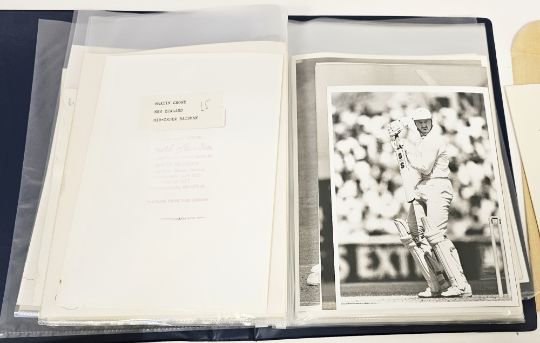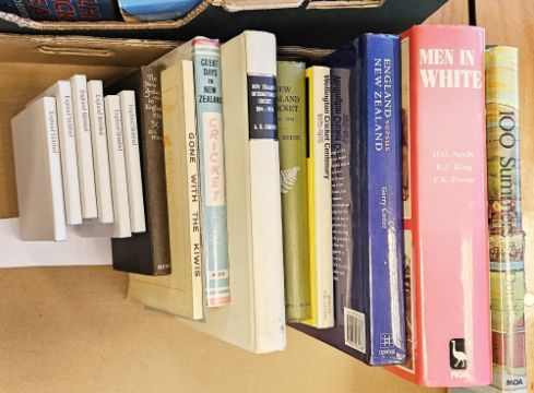 New Zealand interest to include Batty, Mike 'Bill Bernau and the New |Zealand Cricket Tour of England 1927' published by M.A. Batty 49 Murvale Drive, Auckland, this is a private publishing, limp covers with the title handwritten and assorted related letters and ephemera, one signed from Mike Batty, Reese, T.W. 'New Zealand Cricket 1841-1914', Christchurch 1927, green cloth, Carman, Arthur H. (Ed) 'New Zealand International Cricket 1894-1974' (1974) numerous photographic illustrations, cream cloth, six copies of 'England Skittled New Zealand V England Wellington February 1978' published in Christchurch Nags Head Press, dust wrappers, press photos of New Zealand cricketers, one folder and assorted ephemera relating to the England tour to New Zealand in 1978, menu for a dinner, luncheon passes, complimentary tickets one day match January 30th 1978 Hamilton, Rothman's cricket tour tickets, a letter of invitation to Mr Geoff Boycott from the High Commissioner for the United Kingdom a Mrs. T.D. O'Leary for a cocktail reception at Karori and other bits, England team in New Zealand 1977-78 memorabilia, May, P R "With the MCC to New Zealand", Eyre & Spottiswoode 1907, photographic illustrations, the boards are damaged, press photos New Zealand individuals in a ring binder, cricket books, Wisden almanacs, albums and magazines, Smiths Bookshop, Christchurch, New Zealand, etc (1 box)