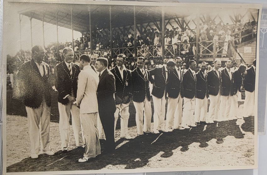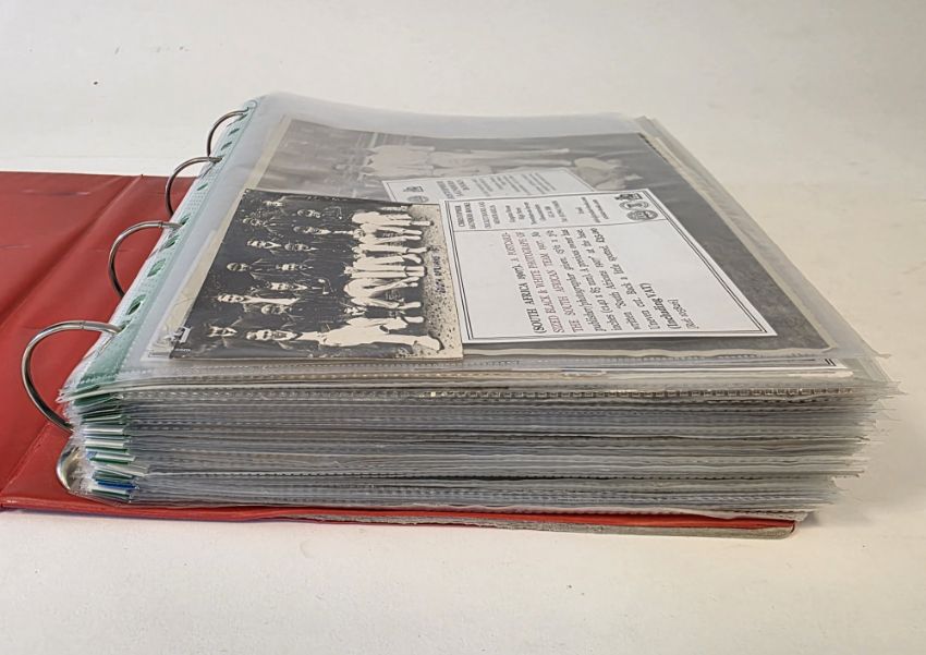 England Internationals signed press photographs, 3 folders, to include Paul Allott, Michael Atherton, Kim Barnett, Christopher Broad, David Capel, John Childs, etc. Team photos to include South Africa, The South African Team of 1907, The South African Team of 1924, Cahn's Eleven team in Jamaica 1928-29, Parsees v Hindus 1935 press photograph, New Zealand tour of England 1978, England tour of India and Sri Lanka, gentlemen and players 1955 played at Scarborough, Gloucestershire County Cricket a colour photograph of the Gloucestershire Team 1987, Hampshire County Cricket Club 1971, a black and white press photograph of four Hampshire players leaping over a bench, Knaves Cricket Club v Jolly Cricketers Cricket Club January 1945 Karachi and many others (please note VAT will be payable on the hammer)