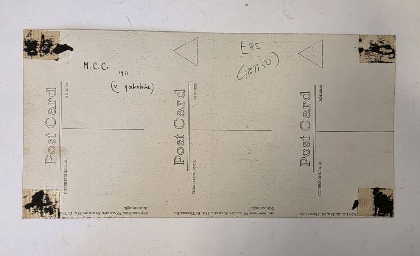 MCC Yorkshire 1933 a photograph by Walkers Studios of Scarborough of the MCC team that played against Yorkshire at Scarborough Festival on 2nd, 3rd and 4th September 1933, 265cm x 130cm, the rear with postcard markings and signs of having been removed from an album, the team standing in the front row of the pavillion was Stevens, Enthoven, Duleep Sinhji, Jupp, Turnbull, Haigh, Eckersley, Gilligan, Hendren, Astill and Kennedy, it has been signed in ink by Duleep Singh and Maurice Turnbull (please note VAT will be payable on the hammer)