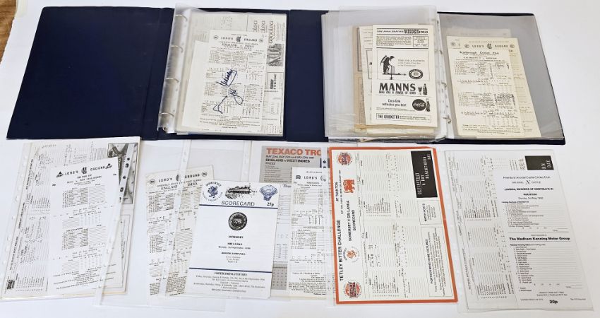 Quantity of signed score cards in ring binders, to include the Lords ground England v India Jubilee match 1982, Lords ground Middlesex v Sussex May 30th 1930, etc and a large quantity of blank Bourne's 'Empire' cricket scording book 'cumulative' 110 years of score books 1877-1987 (1 box)