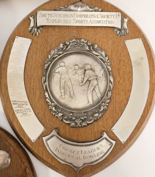 2003 cricket world cup England v India tour cricket ball, two special county cricket balls one inscribed Hants 7, the other Essex v Warwick BAC, signed Surrey county cricket club 150 years commemorative bat signed by 1994 England and South Africa teams, two silver plated mounted oak cricket trophy plaques, green wool cricket cap initialled GRCC with label named for Johnny Dennis (former senior announce of the MCC the voice of the lords) and a Kent and Curwen cable knit cricket slip over 1986 label inscribed Johnny Dennis (please note VAT will be payable on the hammer)